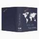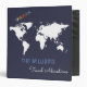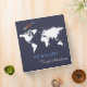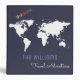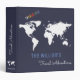 A blue background with a white map of the world and airplanes, and with your own family name in a script font-style with custom words 'Travel Adventures'... to collect photos and memories of your travels around the world