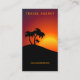 Generic travel agency / tourism services / tour operator business card template on black and orange, with illustration of tropical island sunset, sea and palm trees.