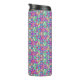 Travel mug with vibrant, kaleidoscopic pattern in pink, blue, and green. Shown from front view and rotated right, black lid on top.