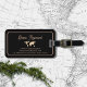 The simplicity of an elegant and modern black tag with a small map of the world at front side, and an airplane at the back... with fields for name and additional information (address, phone-number and email)...