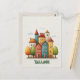 This travel postcard showcases a charming illustration of a colorful cityscape featuring whimsical houses with various shapes and vibrant colors similar to the beautiful capital of Estonia, Tallinn.