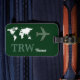front side: a green airplane with the name-initials of the traveller and the world-map