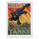 This vintage WWI poster shows a large black cat attacking soldiers with the words Treat 'Em Rough, Join the Tanks. United States Tank Corp around it.