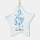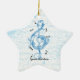 Blue scrollwork sol note key custom ornament, featuring the sol note key in blue scrollwork style and black notes.