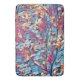 An abstract art design of a small woodland tree in blues, reds and brown colours.