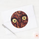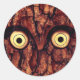 Features an owl made from treebark with big yellow eyes. Cute and rustic.