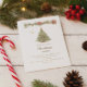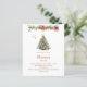 A winter invitation for a Christmas party. A white background on the front decorated with a watercolored hand-drawn pine tree with red and golden ornaments. Some stars and a Christmas decorated garland with cones and red Poinsettia flowers. Personalize and add your party details.