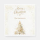 A white background. Decorated with a snowcovered pine tree and faux gold sparkles, snow. Merry Christmas is written with an elegant hand-lettered style script. Personalize and add your family name