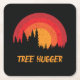 Fun coaster with a nature lover design of a treeline, rising sun, and the words TREE HUGGER.