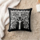 Pillow in a stylized, leaf and branch, tree of life design in white on black
