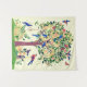 Tapestry in a tree adorned with delicate pink blossoms and teeming with vividly coloured birds amid lush foliage. The scene includes playful hanging ornaments and surreal elements, creating a dreamlike, storybook atmosphere.