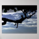 This is a silhouette of young boy reclining in a tree hanging over the water (though water not visible). The image reflects a combination of peace and tranquillity combined with deep thought and contemplation. Behind the subject the clouds can be seen.