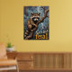 This captivating artwork captures a raccoon with its characteristic markings, skilfully climbing a gnarled tree trunk. The background is a softly focused blend of dark blues and muted yellows, possibly indicating dusk or dawn in the forest. The phrase "CUTE BUT FERAL" is prominently featured in white, stylized letters at the bottom of the image, hinting at the animal's wild nature.