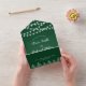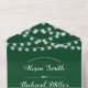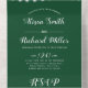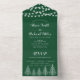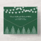 Trees and string lights on emerald green winter all in one wedding invitation. It features white trees and string lights on emerald green. The names are in script typography and the tear off RSVP card can be detached.