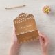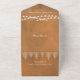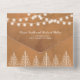 Trees and string lights on stained brown fall all in one wedding invitation. It features white trees and string lights on stained brown colour. The names are in script typography and the tear off RSVP card can be detached.