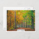 Postcard with deciduous trees with foliage in fall colours and fallen leaves on a path in a forest in Hoge Veluwe nature reserve in the Netherlands during autumn season with a white edge and the text 'Veluwe'.