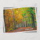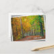 Postcard with deciduous trees with foliage in fall colours and fallen leaves on a path in a forest in Hoge Veluwe nature reserve in the Netherlands during autumn season with a white edge and in white the text 'Veluwe'. The image is a bit rotated to create the illusion of it laying loose.