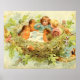 In the vintage children’s book illustration a boy and girl are having a tea party with three robins in their nest and various elves and fairies.