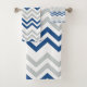 A modern and trendy chevron bath towel set with blue and gray zigzag lines on white.