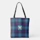 Trendy Blue Plaid Tartan Leather Monogrammed Name Tote Bag