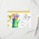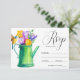 Trendy rustic style wedding invitations RSVP with a watering can full of tulips and flowers and a bird and white and yellow striped pattern on the reverse of the card. These invites are perfect for a country, farmhouse, garden party or barnyard or style wedding party.
