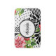 Capture the attention of all your friends with this trendy black and white geometric pattern with diagonal stripes, polka dots, and a chic red floral pattern. Personalize this design that is both modern and girly by adding your name and monogrammed initial to the circle badge in the centre.