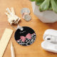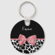 A trendy black and white giraffe print keychain with a girly rosy pink ribbon tied into a cute bow. Personalize this elegant animal print design by adding your name. Flat printed image, not actual bow.
