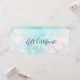An elegant & trendy design of light pastel coloured geometric cube and triangle shapes of blue, lavender and pink, outlined in a faux sparkly gold texture. The design is repeated on the back of the card. The front features a customizable cursive script font for your gift certificate in black. The back also features this text, as well as a place to add your logo, a TO and FROM area for your gift certificate recipients, as well as a spot to fill in the monetary value of the certificate. Along the bottom of the gift certificate, you are able to fill in your additional business information such as your website and address.