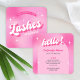 Trendy lashes business cards with girly pink gradient background and retro groovy style fonts that read 'Lashes' and 'hello". These feminine pink lash tech business cards include space for your name, tag line, social media info and contact details, an easy way to make custom contact cards for your lash extensions business, lash salon or eyelash boutique!