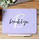 This elegant personalized mouse pad features a monogram and first name in modern black and white script on a trendy lavender background.