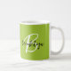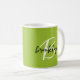 This elegant personalized coffee mug features a monogram and first name in modern black and white script on a lime green background.