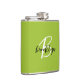 Trendy Lime Green Black White Script Monogram Hip Flask