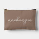 Trendy Mocha White Script Personalized Name Accessory Pouch.