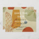 Trendy abstract save the date announcement card. Perfect for a modern wedding. Line protea flower and colourful shapes illustration on paper texture background. Red, yellow and green colours. Botanical minimalist style. Personalise with your names, date and address.