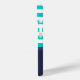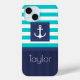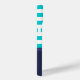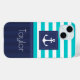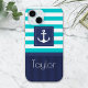 Modern nautical iPhone case with turquoise & navy blue striped pattern and customizable text.