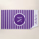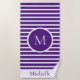 Trendy monogram beach towel with a horizontal purple and white striped design. This item has a purple and white circular border and purple and white customizable lettering, Great for adding a fresh style to your trips to the beach and pool.
