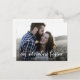 Modern and simple photo save the date postcard featuring a white handwritten script on the front and a template postcard on the back.