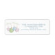 This return address label features trendy non-traditional colour Christmas ornaments in pastel green, pink, and blue with white stars. The ornaments are on the left side of the address template information. Fill in the text fields with your information and change or remove the "Merry Christmas" text over the ornaments..