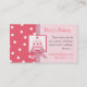 Stylish custom bakery business card done with graphics of a pretty pink cake, in the middle of a pink and a salmon and white polka dot backgrounds. Perfect for a bakery shop, party shop, or an independent custom baker. Customize the text fields to personalize for yourself or your shop.