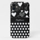 Trendy polka dots heart pattern iPhone 5 case features white polka dots and different style white hearts on a black background and a black accent border frame for your name, initial or other text. Show your personality with this trendy and unique iPhone 5 case. Makes a great gift for all occasions. Click the "Customize it!" button to change the text size, text colour, font style and more!