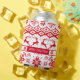 Trendy red Christmas reindeer and abstract snowflakes seamless pattern over white background. Customizable can cooler template