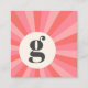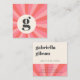 Modern, trendy, square business cards or personal profile cards with your monogram initial in dark grey on a cream coloured circle on a pink retro sunburst background. On the back are customizable template fields for your name and contact information. All colours can be edited in the design tool.