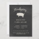 This stylish and simple Friendsgiving invitation for a big Thanksgiving dinner feast with friends features a black chalkboard look background, a farmhouse style pig silhouette, and trendy rustic script. The back of the invitation has a weathered, white wood look.