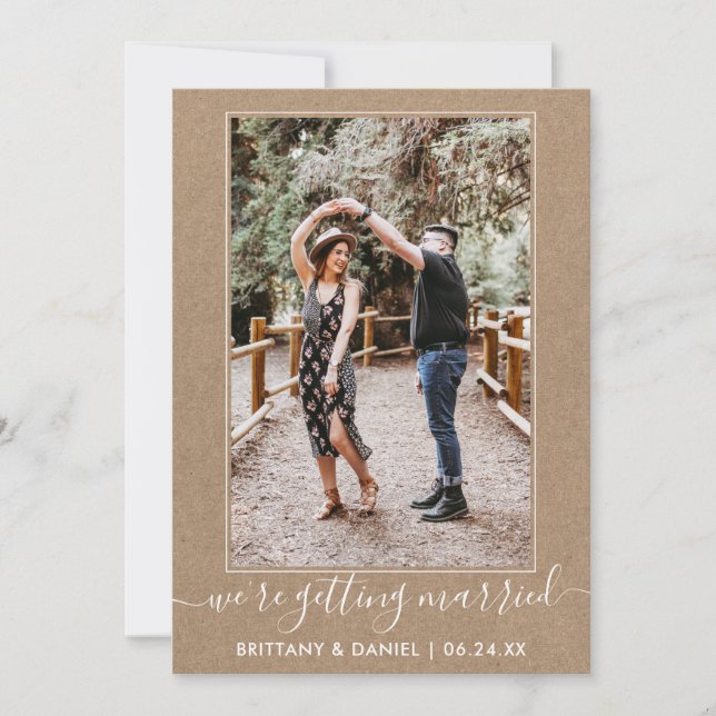 Modern Trendy Calligraphy Script Couple Photo We're Getting Married Save The Date Engagement Announcement Kraft Card