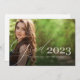 A trendy, elegant 2023 graduation announcement that features two photos of the college or high school graduate. Elegant, modern white script and year on an overlay along with two photos of the graduate. You can adjust the wording on the back of the card to make this either a simple graduation announcement, or a grad party invitation. A stylish and simple graduation design for the class of 2023!