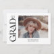 This stylish graduation announcement features the word grad in a trendy serif along the left side. The front has space for a photo of the grad as well as their name, class year, and school. The back of the announcement has space for a second photo and a short message.
