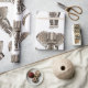 Taupe coloured tribal elephants over a white background patterned bohemian style wrapping paper.
