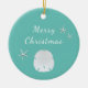Trendy Teal Christmas ceramic ornament, with a sand dollar and starfish design and white customizable typography lettering. A beach inspired addition to your new family's holiday tree.