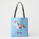 A colourful tote bag which features a cute winged unicorn pool float with colours of the rainbow for its mane, tail and wings. Personalize with name.