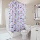 A shower curtain with a repeating pattern. Designed with a trendy pink unicorn. Adorned with a fancy floral headpiece. Whimsical butterflies flying around.